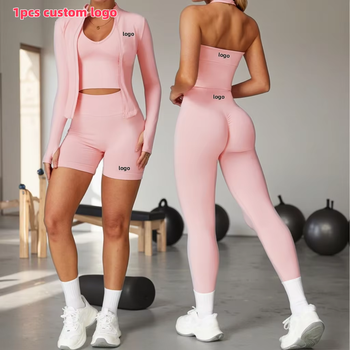 Nahtloses Yoga- und Fitness-Set für Damen mit Individuellem Logo, Bestehend aus Jacke, Leggings, Neckholder-BH und Biker-Shorts, 4-Teiliger Sportanzug für das Fitnessstudio